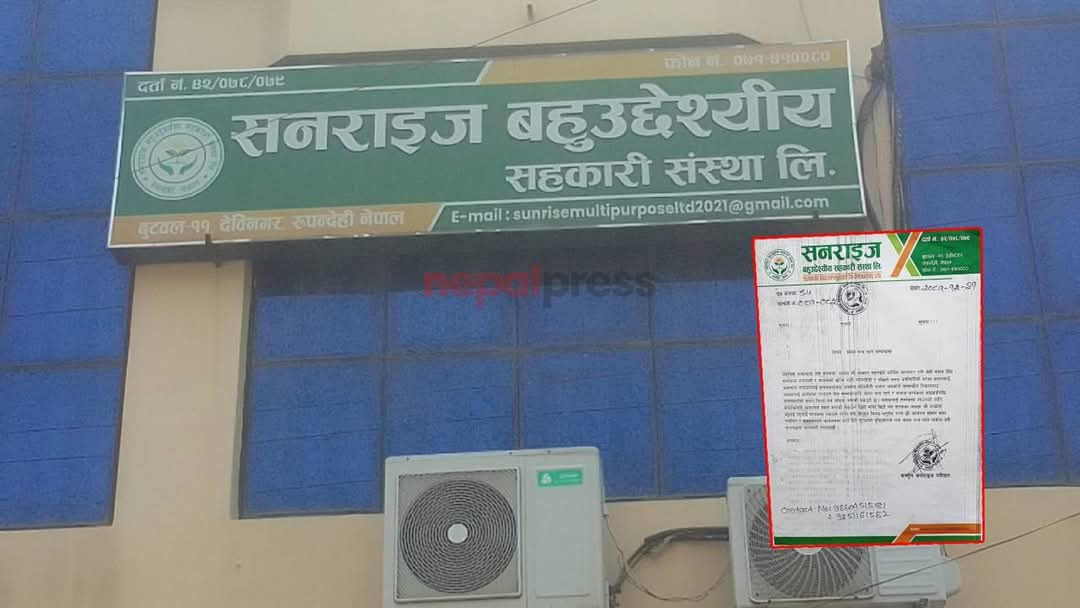 अहिले सहकारीका अध्यक्ष आकाश भट्टराई र कोषाध्यक्ष वसन्त भट्टराई सम्पर्कविहीन भएसँगै यसका बचतकर्ताको बिचल्ली भएको हो ।०७८ सालमा लुम्बिनी प्रदेशमा दर्ता भएर बुटवल उपमहानगर वडा न ११ देवीनगरमा यसको कार्यालय सञ्चालन गरिएको यो सहकारी ०८१ चैत ३१ गतेदेखि कार्यालयमा सूचना टाँस गरेर एकाएक बन्द गरिएको बचतकर्ताले जनाएका छन् । सूचना टाँसिएको मितिसम्म पनि कर्मचारीले बजारमा नियमित दैनिकी उठाइरहेको भेटिएको छ ।०७८ सालमा लुम्बिनी प्रदेशमा दर्ता भएर बुटवल उपमहानगर वडा न ११ देवीनगरमा यसको कार्यालय सञ्चालन गरिएको यो सहकारी ०८१ चैत ३१ गतेदेखि कार्यालयमा सूचना टाँस गरेर एकाएक बन्द गरिएको बचतकर्ताले जनाएका छन् । सूचना टाँसिएको मितिसम्म पनि कर्मचारीले बजारमा नियमित दैनिकी उठाइरहेको भेटिएको छ ।सहकारी दर्ता भएपछि ०७९ सालमा साधारणसभा गरिए पनि त्यसयता सम्बन्धित निकायमा सम्पर्कमा नआएर बजारबाट चार वर्षदेखि निरन्तर पैसा उठाउँदै आएकाले बचतकर्ताको कति रकम उठ्यो भन्ने कुनै विवरण नखुलेको हो ।बचतकर्ताले चैत ३१ गतेसम्म बजारबाट रकम उठाएर सोही दिन नै सूचना टाँस गरी बन्द भएपछि उनीहरू आश्चर्यमा परेका हुन् । कार्यालयको भित्तामा टाँसिएको सूचनामा सहकारीका अध्यक्ष आकाश भट्टराईले आर्थिक अपचलन गरी केही समयदेखि सम्पर्कमा नआएको, अध्यक्षको खोजी जारी रहेको र पछिल्लो समयमा कर्मचारीको भरमा बजारलाई चलायमान बनाउनका लागि बचतकर्ताबाट असहज परिस्थिति सृजना भएको भन्दै गत चैत ३१ गतेको मितिमा सूचना टाँसिएको छ ।उल्टै सूचनामा बचतकर्तालाई अध्यक्षको खोजी गर्न आवश्यक पहल गर्न अपिल गरिएको छ । यो सहकारीमा तीन किसिमको बचत गर्दै आएका व्यवसायी दिलबिन्दु थापाका अनुसार ३१ गतेसम्म यसका कर्मचारीले रकम उठाइरहेपनि सोही दिन नै सूचना राखेर बन्द गरिएको हो ।मेरो दैनिक ३ प्रकारको बचत थियो यो सहकारीमा। ३१ गतेसम्म त पैसा उठाउँदै हिँड्नु भएको थियो कर्मचारीहरू । नयाँ वर्षकै दिनदेखि फरार भएछ । सरकार छिटोभन्दा छिटो फरार व्यक्तिलाई कानुनको कठघरा उभ्याइ पीडितलाई न्याय दिलाइदेऊ’ उनले भनेका छन् ।मेडिकल व्यवसाय गर्ने थापा बुटवलमा लामो समयदेखि विभिन्न सामाजिक संघसंस्थाहरुमा पनि जोडिएका छन् तर उनले यसरी सहकारीबाट ठगिने कल्पना पनि नगरेको बताएका छन् ।उनीजस्तै अर्का व्यवसायी लक्ष्मण क्षेत्रीले पनि आफू सनराइज सहकारीबाट ठगिएको बताएका छन् । बुटवलका स्थापित व्यवसायी क्षेत्रीले समेत सहकारीबाट ठगिनुपरेपछि अरू सामान्य नागरिकले यसको संकेत पाउने कुरै भएन ।सहकारीले कार्यालयमा सूचना टाँसी गरी सहकारी बन्द गरेको आन्तरिक रूपमा हल्ला भएपछि आफ्नो बचत रकम लिनका लागि कार्यालयमा आएकी बुटवल उपमहानगरपालिका वडा 