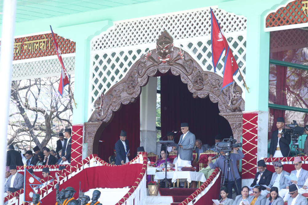 काठमाडौं – सैनिक मञ्च टुँडिखेलमा विभिन्न कार्यक्रमहरुको आयोजना गरी गणतन्त्र दिवश मनाइएको छ । कार्यक्रममा राष्ट्रपति रामचन्द्र पौडेल, उपराष्ट्रपति रामसरायप्रसाद यादव, प्रधानमन्त्री केपी शर्मा ओली, प्रतिनिधि सभाका सभामुख देवराज घिमिरे, राष्ट्रिय सभा अध्यक्ष नारायण प्रसाद दाहाल, उपप्रधान मन्त्रीहरु प्रकाशमान सिहं, विष्णु प्रसाद पौडेल, प्रधानन्यायधीस प्रकाशमान सिंह, नेपाल सरकारका मन्त्रीहरु लगायत उच्च पदस्थ व्यक्तिहरुको उपस्थिति रहेको थियो ।
