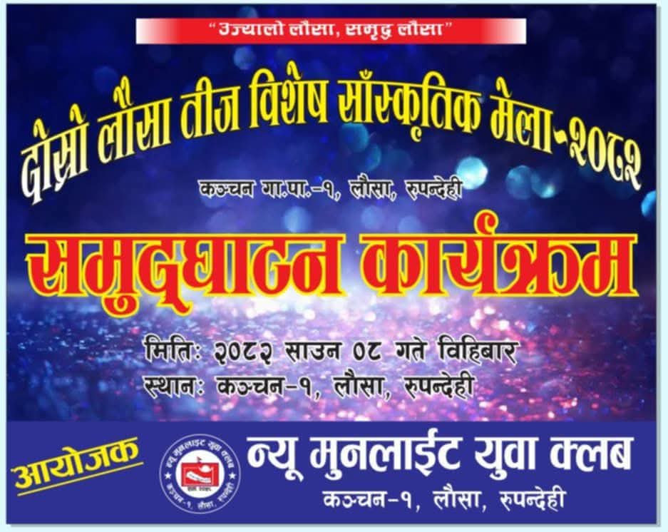 उज्यालो लौसा समृद्ध लौसा भन्ने मूल नाराका साथ यही साउन ८ गतेदेखि २२ गतेसम्म लौसा दोस्रो तीज विषेश कार्यक्रम रुपन्देहीको कञ्चन गाउँपालिका लौसामा हुने भएको छ ।