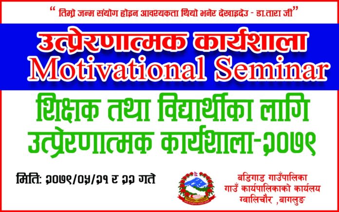 त्यस्तै बडिगाड गाउँपालिकाले शिक्षक तथा विद्यार्थीहरुका लागि २ दिने उत्प्रेरणात्मक कार्यशाला सञ्चालन गर्न लागेको छ। भाद्र २१ र २२ गते कार्यशाला सञ्चालन गर्न लागेको र सो कार्यशालामा बडिगाड गाउँपालिका भित्रका सवै शिक्षक तथा कक्षा १० का विद्यार्थीहरु सहभागिहुने पालिकाले जनाएको छ। सो उत्प्रेरणात्मक कार्यशालाको डा. तारा गिरिले सहजिकरण गर्ने कार्यक्रम रहेको छ।